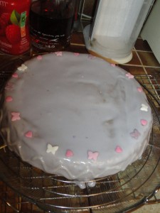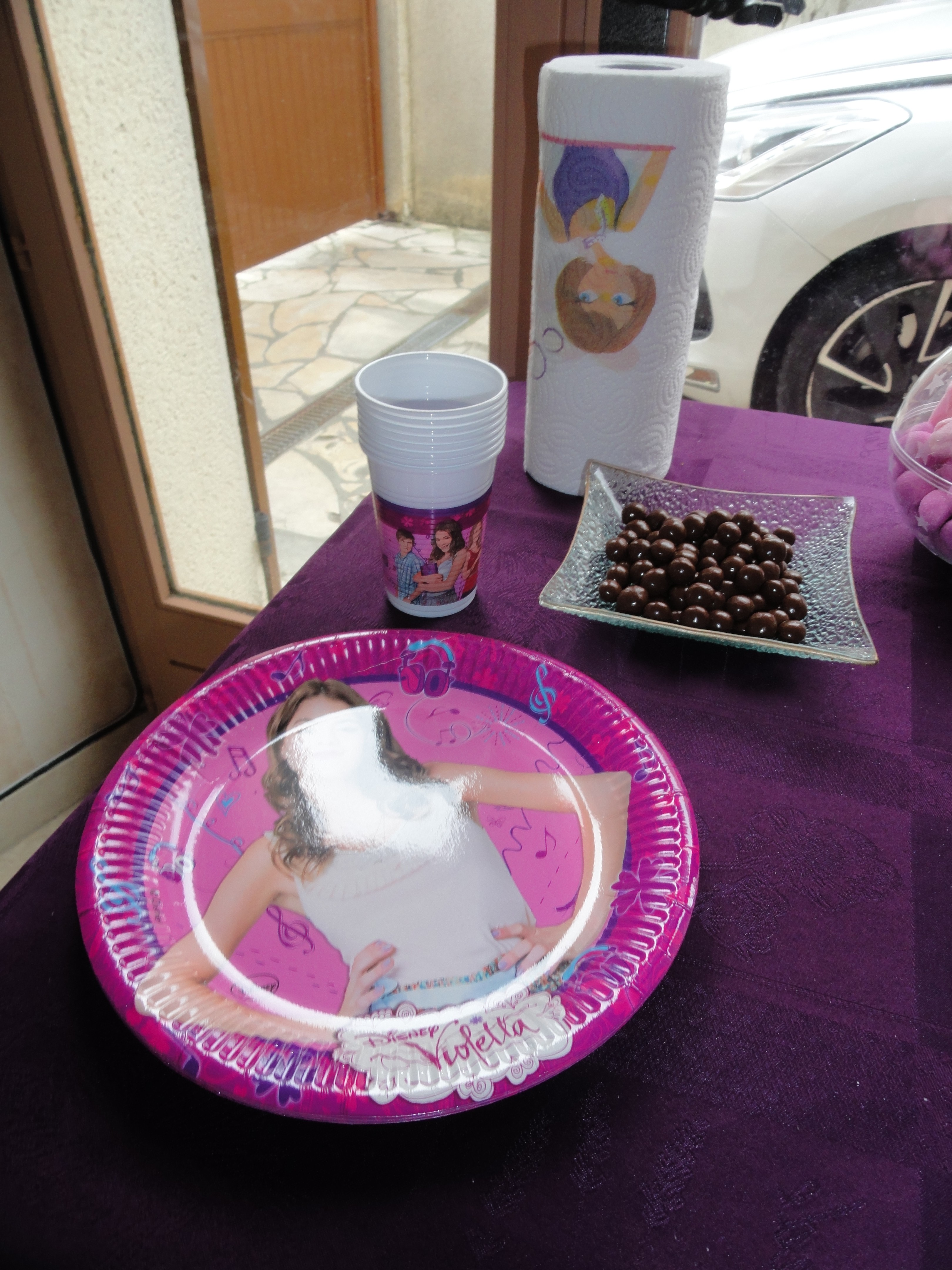 Maman avait décoré la salle et m’avait fait un gâteau …violetta (2 parfums un étage vanille et l’autre violet a l’Hibiscus, glacage violet) même les bonbons étaient violet 😉