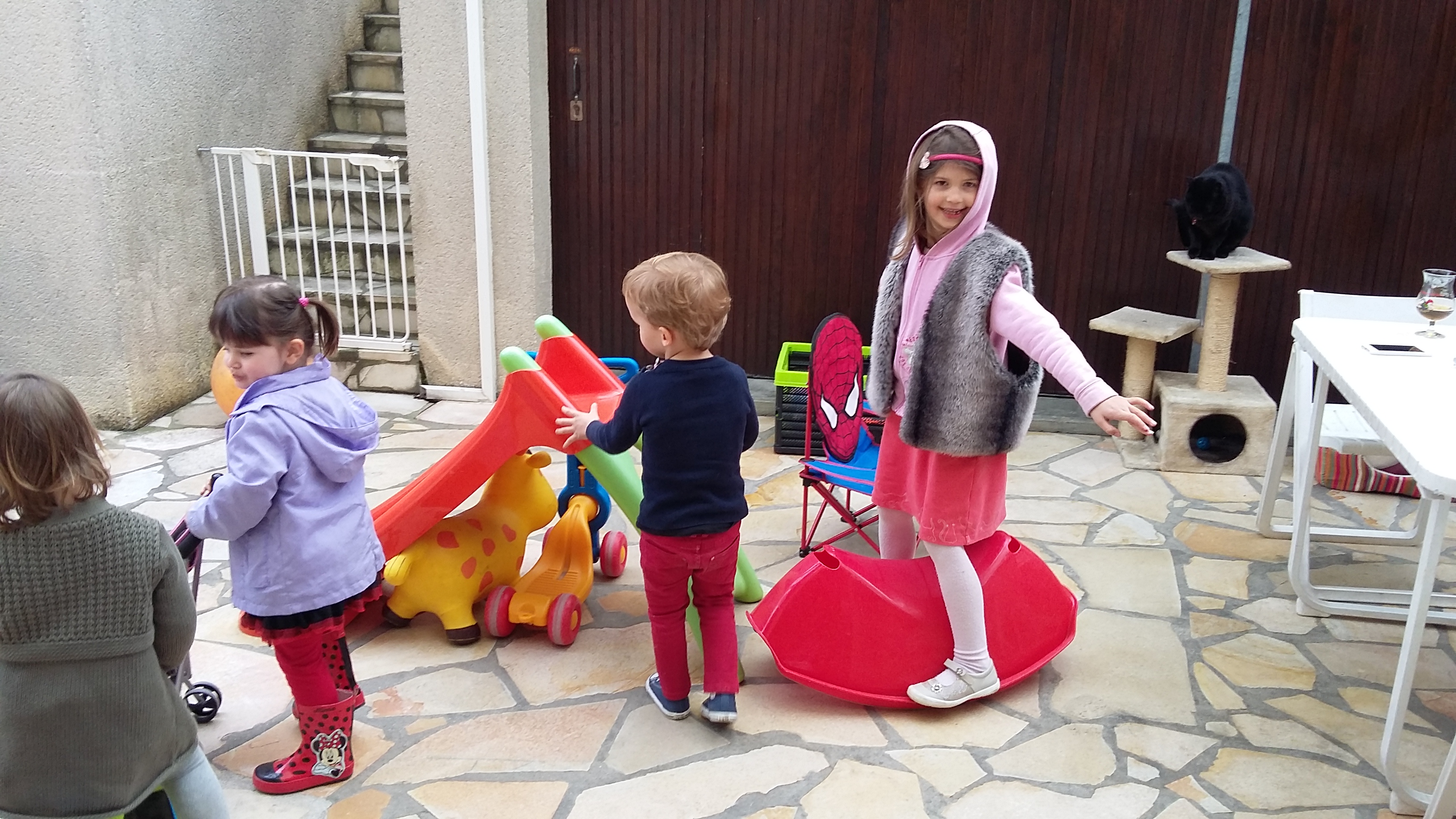 Après la sieste, j’ai pu faire la fête avec mes copines Alice et Célia et le petit Gabriel (le petit fils de la voisine d’en face) avec qui je m’entend bien.